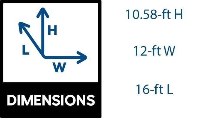 - Assembled dimensions: 144 in. W x 192 in. D x 127 in. H