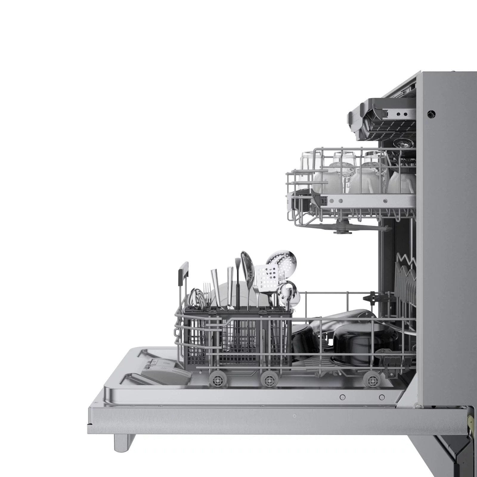 - Standard 3rd rack provides the perfect space for silverware and large utensils, while its V shape leaves room below both sides for taller items like stemware. Also includes a lower rack silverware basket