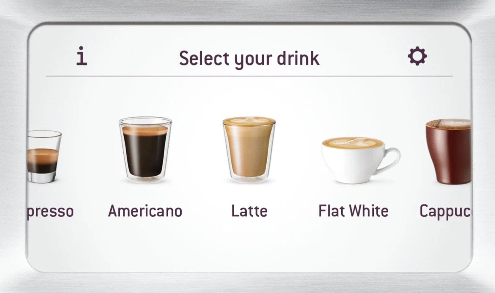 Intuitive touch screen display simplifies how to make your favorite cafe coffee in 3 easy steps, Grind, Brew and Milk. You can adjust the coffee strength, milk texture and temperature to suit your taste. Then save the setting name.