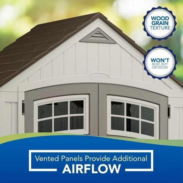 Make outdoor organization simple with this product. The capacity provides ample space to store large outdoor items such as garbage cans and recycling bins, long-handled garden tools, ladders, bikes, and more. It’s durable, multi-wall resin construction is the weather, water, and UV-resistant and can withstand adverse weather conditions and wind gusts up to 60 mph. The double doors provide a wide opening to access items in the shed, and a padlock can be used to lock the unit for extra security (lock not included). The built-in vents allow for proper airflow, and multiple windows provide natural light and visibility into the shed. The reinforced floor provides extra support for heavier items such as tractors and ride-on lawnmowers with recommended install on a level, concrete foundation. It also offers convenient maintenance – simply wipe with a damp cloth for easy cleanup. This storage shed is easy to assemble with minimal tools required. The decorative siding panels and shingle-pattern roof make this shed an attractive and functional outdoor storage solution.