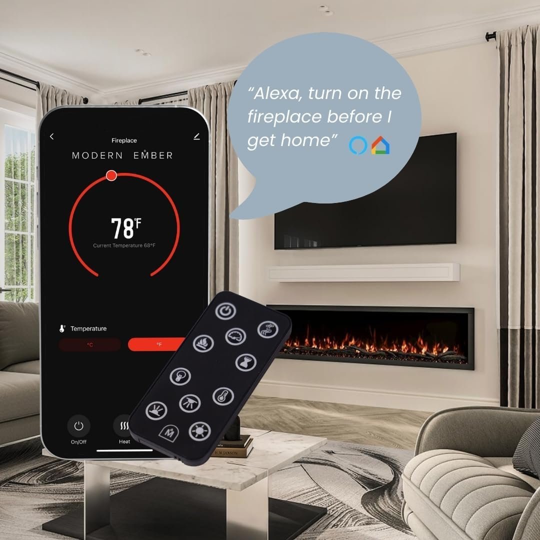 • Elevate your living space with the Modern Ember Highmark 60-Inch Smart Linear Electric Fireplace, a perfect blend of modern design and advanced technology. Designed for recessed in-wall or wall-mounted installation, this premium electric fireplace offers a sleek hidden vent design and ultra-realistic flame display with 10 customizable flame colors to suit any ambiance.