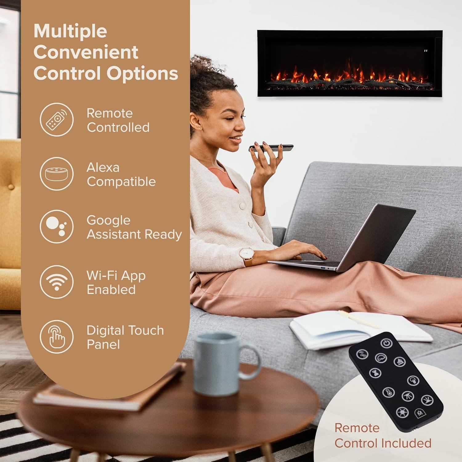 WiFi-enabled and compatible with smart home controls, the Highmark lets you adjust flame color, brightness, and heat settings directly from your smartphone or voice assistant. Its premium LED lighting system delivers lifelike flames, while the powerful yet quiet heater provides supplemental warmth for rooms up to 400 sq. ft.