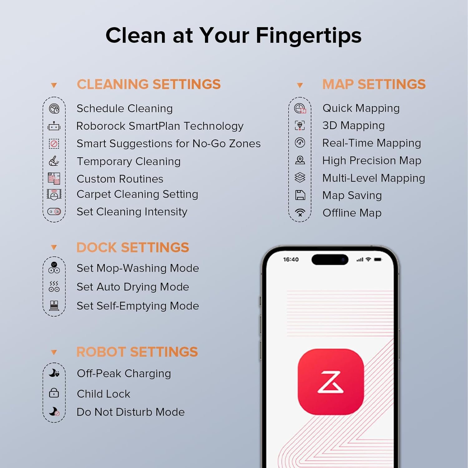 • Control at Your Fingertips: Manage all things with the upgraded Roborock app. Advanced AI algorithms ensure smarter, stress-free cleaning. Diverse functions, including routines, map details, washing temperatures, drying duration, and maintenance conditions, are easily managed in the app.