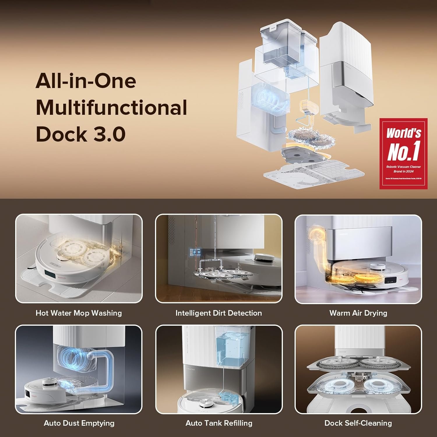 • Master-Class Maintenance-Free Experience: All-in-One Multifunctional Dock 3.0 with hot water. Up to 167℉, hot water mop washing and self-cleaning bring cleaning to the next level, easily getting rid of stubborn stains and maintaining a spotless home environment. A dust bag as large as 2.7L supports over 60 days of hassle-free cleaning.