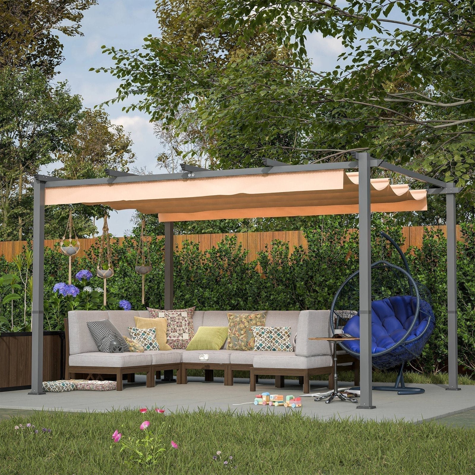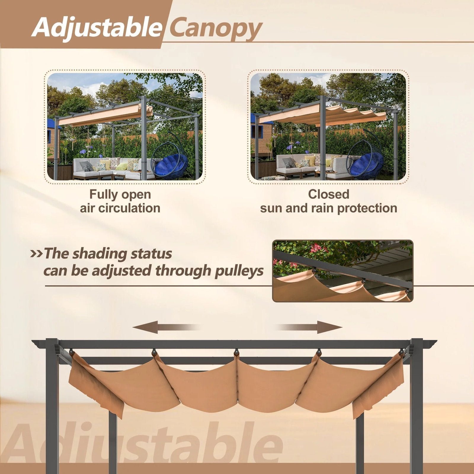 - Retractable Pergola Canopy: Enjoy customizable shade with the retractable canopy, allowing you to control the amount of sunlight and glare to suit your needs. Create a sunburn-free zone or bask in the warm sunlight as desired.