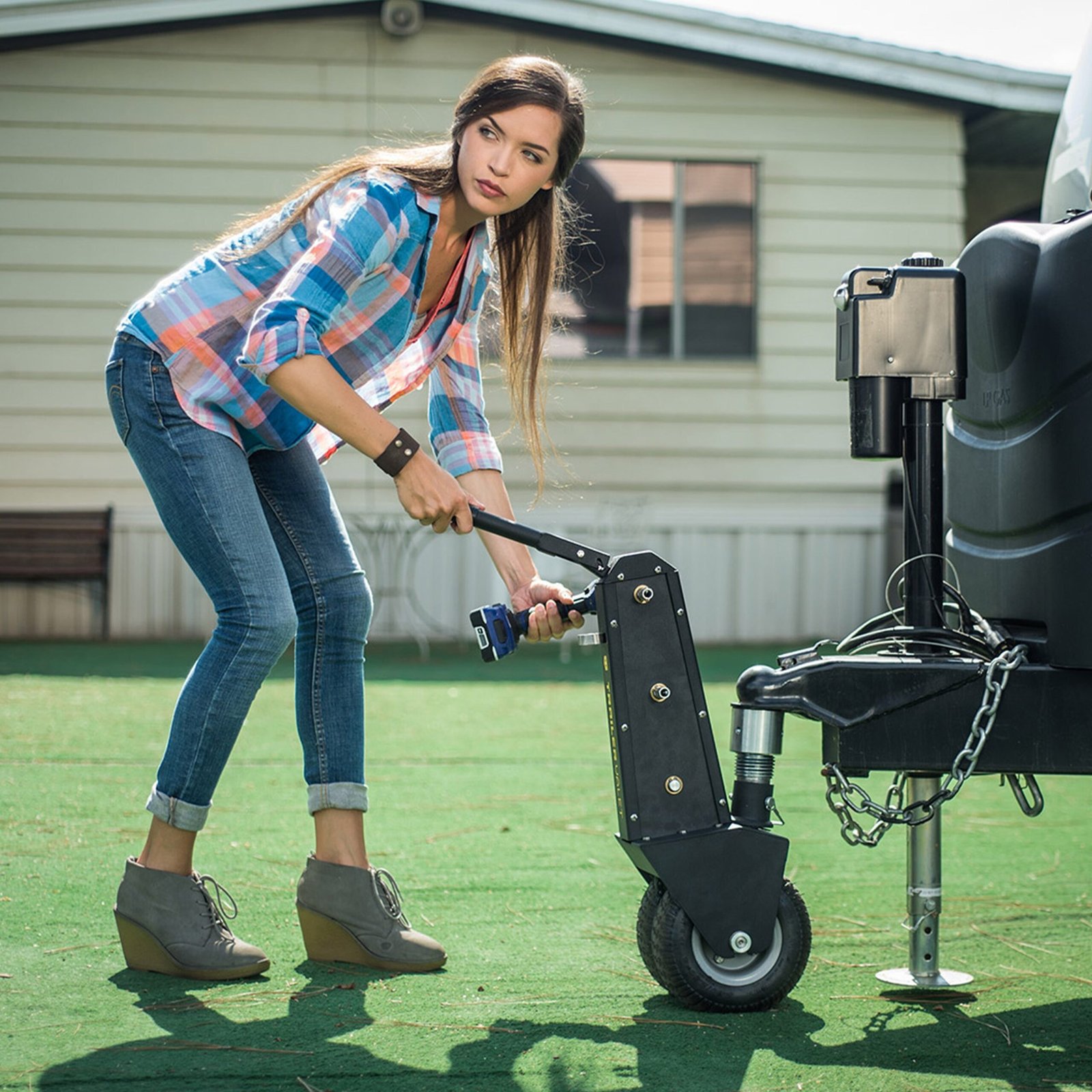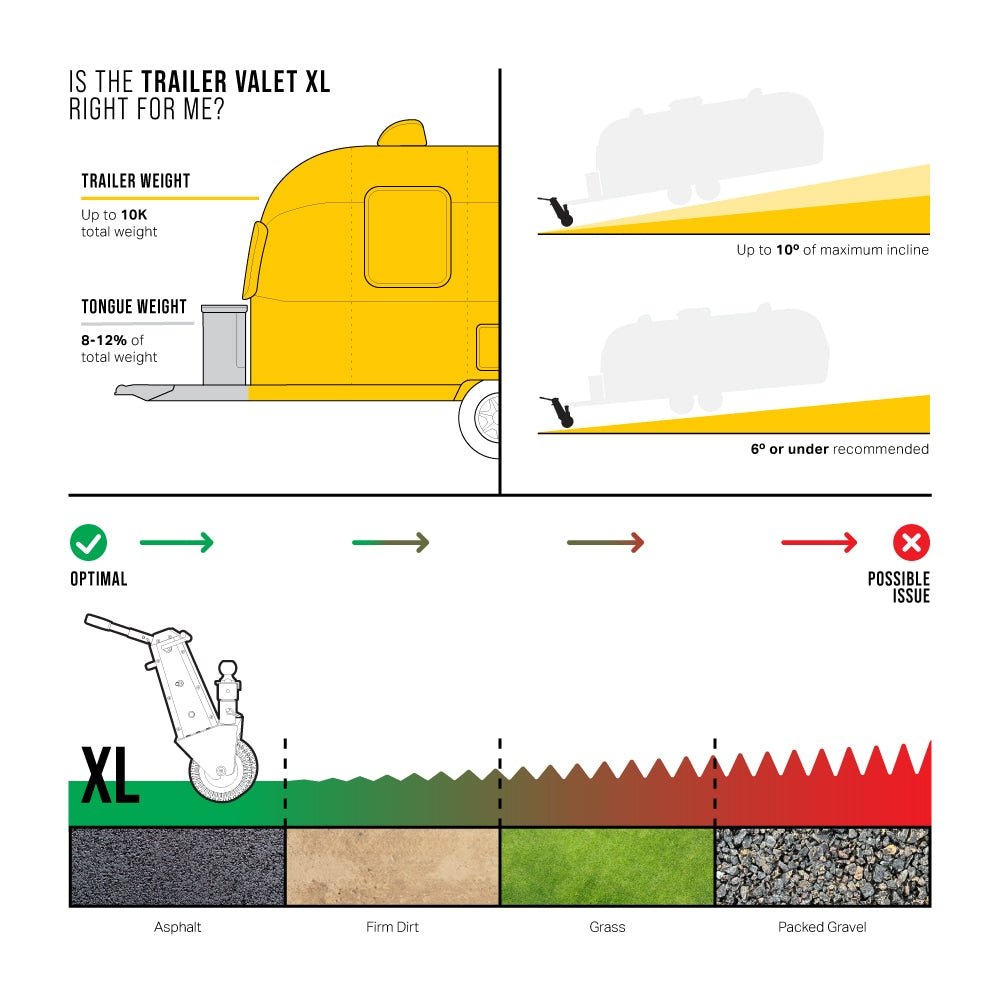 The Trailer Valet XL makes it easy to park or move your trailer of up to 10,000 lbs (4,500 kg) in tight spaces. Take corners and position your trailer exactly as you want it by steering as you move. The XL hooks up to a standard trailer frame via the coupler (or optional bracket) and can be operated manually by using the included hand crank as a trailer hand dolly. For added power, swap out the hand crank with a standard 20-24V cordless drill, and power up your mover for greater ease of use. Low and high gear ability allow switching between precision of control and rapid movement as needed. Each unit comes with never-flat solid rubber tires and an auto-brake function, providing trailer movement safety and security at all times. With a compact design and the power the move larger trailers, the XL is essential for anyone wishing to maneuver and hitch their trailer without manual pulling or backing up the truck. Standard 2-5/16 inch ball included (also available with 2 inch ball size)Maneuver larger trailers precisely, without the need for a vehicleNo hand-cranking necessary: mover can be powered with any 20-24V non-impact drillSaves time and manual labor when hitching up the trailerUp to 10,000 lbs towing capacity when trailer is on a hard level surface, properly loaded and attached using the ball and base (up to 8,000 lbs towing when using the optional XL bracket TVXLMB)Optimal use with 10-12% vertical or tongue weightHigh and low drive gear system for more precise movementSolid rubber tires for increased stabilityRugged steel construction and zinc-nickel plating to prevent rustingRecommended for use on a flat, concrete-like surface and minimum 10% tongue weight ratio – product performance may decrease on inclines, loose surfaces, and with evenly distributed trailer weight.